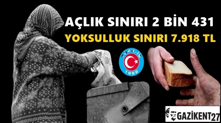 Türkiye İşçi Sendikaları Konfederasyonu (Türk İş), haziran ayında 4 kişilik ailenin açlık sınırını 2 bin 431 lira 8 kuruş, yoksulluk sınırını ise 7 bin 918 lira 82 kuruş olarak hesapladı.
