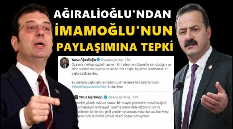 İYİ Parti Genel Başkan Yardımcısı ve İstanbul Milletvekili Yavuz Ağıralioğlu, İstanbul Büyükşehir Belediye (İBB) Başkanı Ekrem İmamoğlu’nun yaptığı 8 Mart Dünya Kadınlar Günü paylaşımına tepki göstererek,” HDP ve siyasilerinin isimlerinin, şehit annelerine borcunu vatan borcu bilen Meral Akşener ismi ile birlikte zikredilmesini doğru bulmuyorum. Öcalan’a mektup yazdırılmasının milli iradeyi ne istikamette kamçıladığını ve ikinci seçimin sonuçlarına ne yönde tesir ettiğini hiç kimse unutmamalı! En başta da Ekrem Bey” ifadelerine yer verdi.