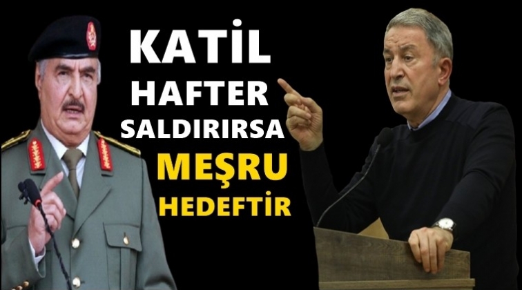 Milli Savunma Bakanı Hulusi Akar, Türkiye'ye karşı savaşa hazır olmaları çağrısı yapan Libya'daki gayrimeşru silahlı güçlerin lideri Halife Hafter'e yanıt verdi: Katil Hafter ve destekçileri Türk unsurlarına saldırı girişiminde meşru hedef olarak görülecektir.