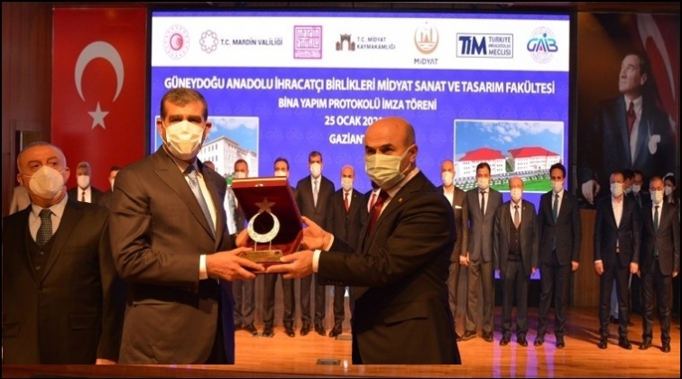 Midyat’a kurulacak olan fakültenin, bölgenin kalkınmasına olumlu katkı yapacağını da vurgulayan Başkan Altunkaya şöyle devam etti: “Fakültenin, bölgemizin tüm birikiminin daha yüksek seviyede üretime ve ihracata dönüştürülmesi için gereken nitelikli insan gücünün yetiştirilmesi açısından önemli bir işlev göreceği kuşkusuzdur. Bugün Mardin Valisi Sayın Mahmut Demirtaş, Midyat Kaymakamı Sayın Tekin Dündar, Midyat Belediye Başkanı Veysi Şahin, Mardin Artuklu Üniversitesi Rektörü Sayın Prof. Dr. İbrahim Özcoşar katılımıyla ortak bir protokol imzalayarak fakülte binası için startı verdik. Güneydoğu Anadolu İhracatçı Birlikleri Midyat Sanat Ve Tasarım Fakültesi adıyla hizmet verecektir.” dedi. İmzalanan protokolün ardından Mardin Valisi Mardin Valisi Mahmut Demirtaş, Artuklu Üniversitesi Rektörü Prof. Dr. İbrahim Özcoşar ve Midyat Belediye Başkanı Veysi Şahin katkı sağlayan ihracatçılara günün anısına birer teşekkür plaketi verirken Başkan Mahsum Altunkaya’da Mardin Valisi Mardin Valisi Mahmut Demirtaş, Midyat Kaymakamı Tekin Dündar, Artuklu Üniversitesi Rektörü Prof. Dr. İbrahim Özcoşar ve Midyat Belediye Başkanı Veysi Şahin’e desteklerinden dolayı günün anısına birer plaket verdi.