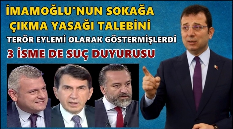 İBB Başkanı Ekrem İmamoğlu, corona virüsü vakalarının en çok görüldüğü İstanbul için yaptığı “sokağa çıkma kısıtlanması” talebini terör eylemi olarak lanse eden gazeteciler Ersoy Dede, Fuat Uğur ve Murat Çiçek hakkında suç duyurusunda bulundu.