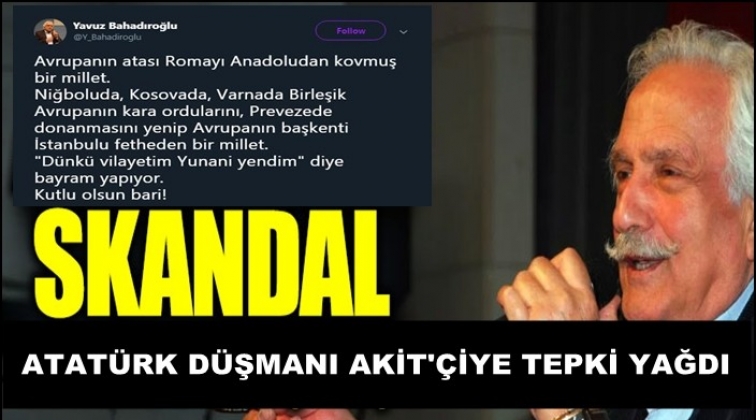 Tarihçi ve Yeni Akit gazetesi yazarı Yavuz Bahadıroğlu sosyal medya hesabından bir paylaşımda bulundu. 30 Ağustos Zafer Bayramı’nı küçümseyen Bahadıroğlu, “Avrupanın atası Romayı Anadoludan kovmuş bir millet. Niğboluda, Kosovada, Varnada Birleşik Avrupanın kara ordularını, Prevezede donanmasını yenip Avrupanın başkenti İstanbulu fetheden bir millet. ‘Dünkü vilayetim Yunani yendim’ diye bayram yapıyor. Kutlu olsun bari!” ifadelerini kullandı.