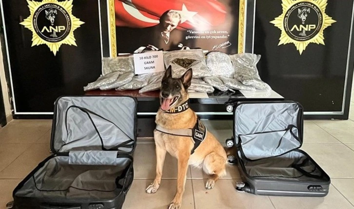 Eğitimli köpek kullanılarak yapılan aramada, araçtaki bavul içerisinde piyasa değeri 4 milyon TL olduğu belirtilen 10 kilo 700 gram skunk ele geçirildi. Uyuşturucuya el koyan ekipler, araçta bulunan S.Ş., M.D. ve E.A.'yı gözaltına aldı.