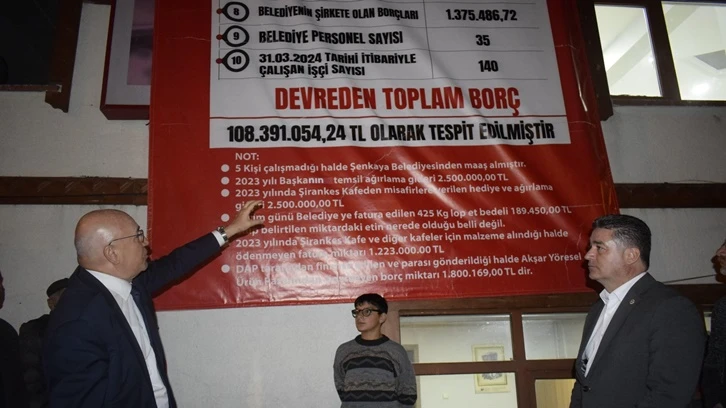 31 Mart yerel seçimlerinde Erzurum Şenkaya Belediye Başkanı seçilen CHP’li Görbil Özcan, eski dönemden kalan 108 milyon 391 bin TL’lik borcun dağılımını içeren pankartı belediye binasına astı. Pankartta, 5 kişinin hiç çalışmadığı halde maaş aldığı, seçim günü belediyeye 425 kg et bedelinin fatura edildiği bilgisi yer aldı.