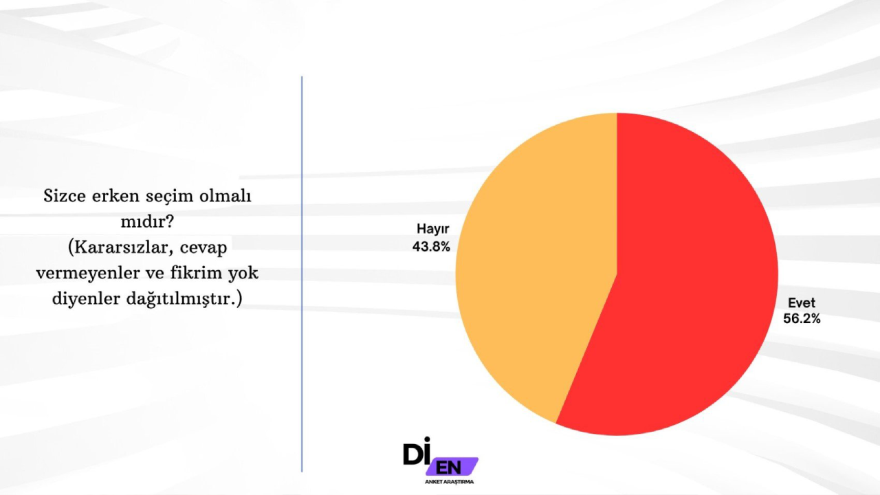 Erken seçim isteyenler yüzde 56.2 çıkarken erken seçim istemeyenler ise yüzde 43.8 olarak yer aldı.