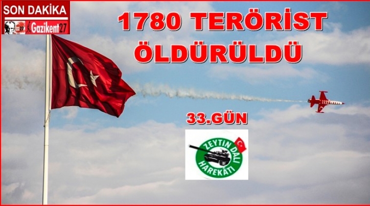 Zeytin Dalı Harekâtı’nın 33. gününde Afrin’de bugüne kadar 1780 PKK/KCK/PYD-YPG ve IŞİD terör örgütü mensubu etkisiz hale getirildi.