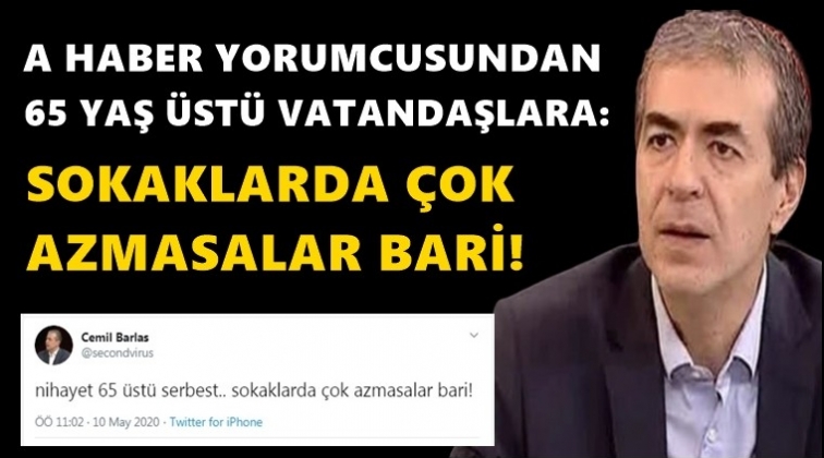 Yandaş A Haber yorumcusu Cemil Barlas, 65 yaş üstü vatandaşlara sokağa çıkma izninin başlamasıyla ilgili attığı tweet tepki çekti.