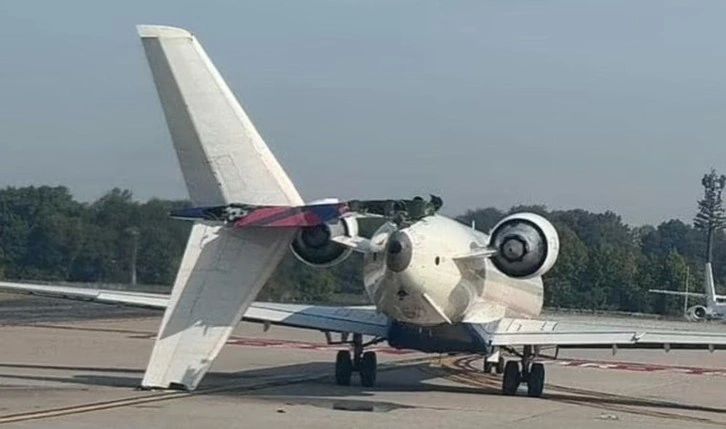 Kazayla ilgili paylaşılan videoda, çarpışma nedeniyle Bombardier tipi uçağın kuyruk kısmının bütün olarak yere düştüğü görüldü.