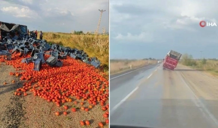 Seyir halindeki domates yüklü kamyonetin lastiği patladı. Lastiğin patladığı tarafa yatık giden kamyonet bir süre sonra devrildi.