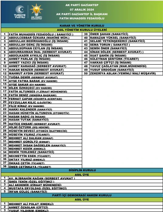 İl Başkanı Fatih Muhaddis Fedaioğlu, 7 Aralık’ta AK Parti’nin 8. Olağan İl Kongresi’nde seçildikten sonra, Şehitkâmil İlçe Seçim Kurumu’nda düzenlenen törenle mazbatasını İlçe Seçim Kurulu Başkanı Hakim Ramazan Can’ın elinden aldı. Fedaioğlu, mazbatasını teslim alarak resmi görevine başladı.