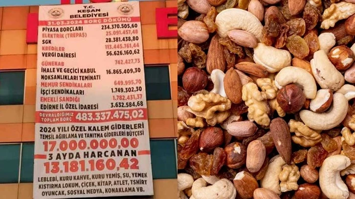 Yerel seçimde AKP’den CHP’ye geçen Keşan Belediyesi’nin borçları belediye binasına asıldı. Bir önceki dönemin borçları dudak uçuklatırken, kuruyemiş ve benzeri giderlere üç ayda 13 milyon lira ödeme yapıldığı ortaya çıktı.