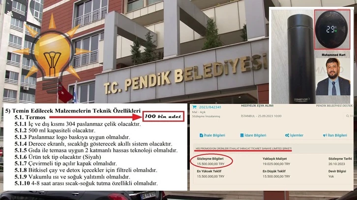 AKP'li Pendik Belediyesi, çeşitli yerlerde hediye olarak dağıtmak üzere 100 bin termos alımı için ihale düzenledi. İhale AKP'ye yakın Muhammed Kurt isimli kişiye gitti. İhalenin bedeli ise tam 15,5 milyon TL.