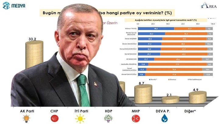 AREA Araştırma Şirketi'nin son anket çalışmasının sonuçları kamuoyuyla paylaşıldı. Cumhurbaşkanı ve AKP Genel Başkanı Erdoğan, iktidar partisinin birinci çıktığı ankette ilk sırayı alamadı.
