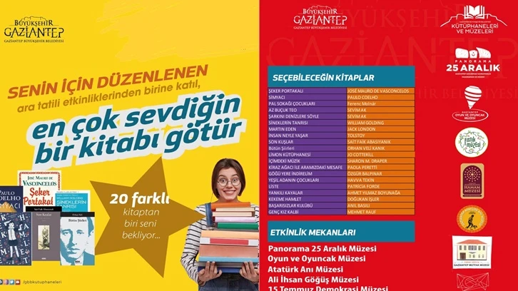Gaziantep Büyükşehir Belediyesi’ne bağlı Gaziantep Sanat Merkezi, çocuk kütüphaneleri ve Oyun ve Oyuncak Müzesi’nde okulların ara tatili için hazırlanan etkinliklere katılan çocuklara kitap hediye edilecek.