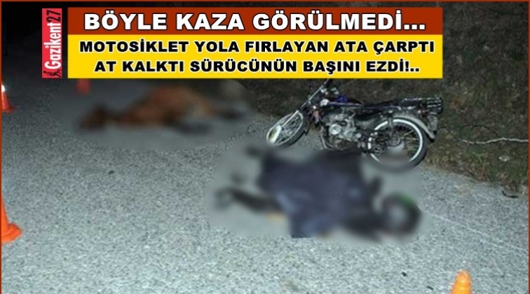 Gaziantep'te filmlerde bile olmayacak bir kaza yaşandı. Motosikletli genç, yola fırlayan ata çarptı. Ayağa kalkan at, yerde yatan motosiklet sürücüsünün başını ezerek öldürdü.