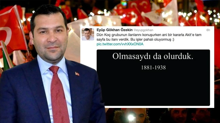 Eyüp Gökhan Özekin, Mustafa Kemal Atatürk’ün ölüm yıl dönümü olan 10 Kasım’da Yeni Akit’e Mustafa Kemal Atatürk hakkında bir ilan yayımlanmıştı. Tam sayfalık ilanda Atatürk için “Olmasaydı da olurduk” ifadesi ve 1881-1938 tarihleri kullanılmıştı.