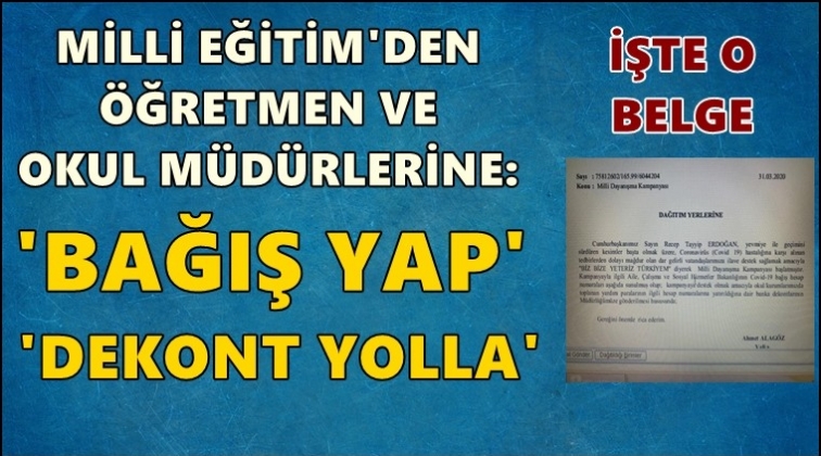 Sözcü'den Sultan Uçar'ın haberine göre, okulların iç yazışma gruplarına gönderilen mesajda; idareci ve öğretmenlerden, Cumhurbaşkanı Erdoğan'ın başlattığı Milli Dayanışma Kampanyası için para toplamaları, makbuzları da il ve ilçe milli eğitim müdürlüklerine göndermeleri istendi.