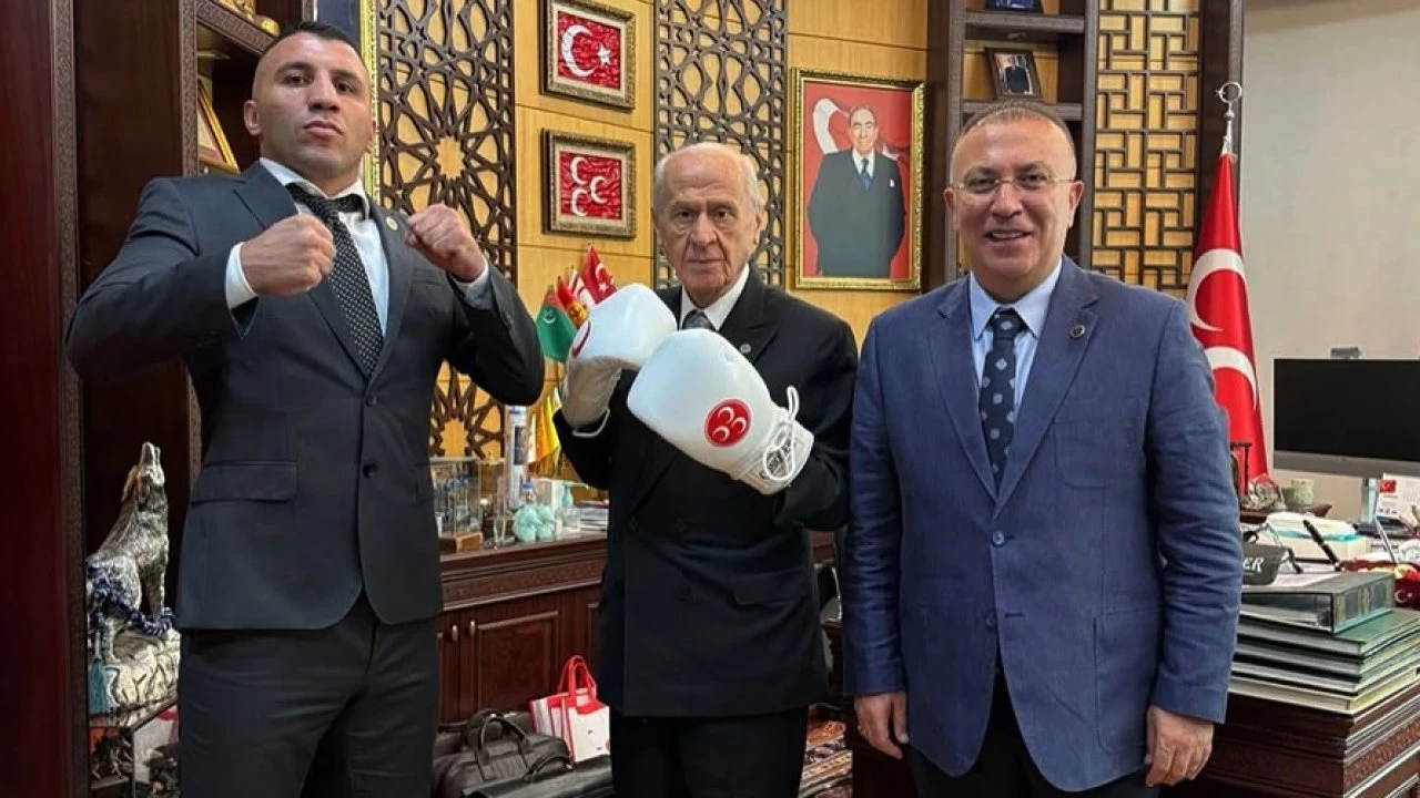 Ziyaretin ardından MHP lideri Bahçeli, üzerinde partisinin sembolü 3 hilal bulunan boks eldivenleri ile poz verdi.