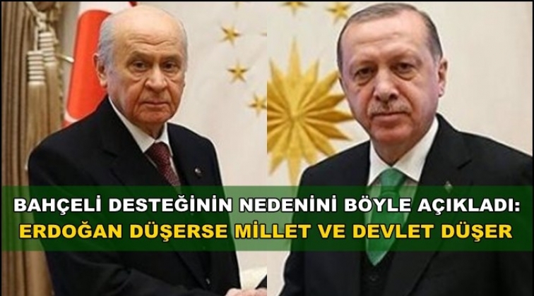 MHP Genel Başkanı Devlet Bahçeli, Cumhur İttifakı’nda olmalarının ve AKP’li Cumhurbaşkanı Recep Tayyip Erdoğan’a desteğinin nedenini açıklarken "Sayın Cumhurbaşkanı’nın düşmesi, milletin devletin düşmesi anlamına geldiği için yanındayım' dedi.
