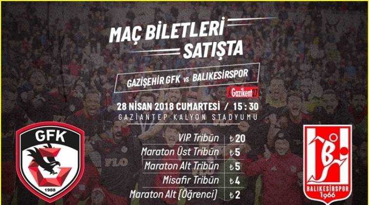 Taraftarlar, Maraton Tribün biletleri öğrencilere 2 TL'den, Maraton Alt ve Üst Tribün 5 TL'den passolig kartlarına bilet dolumu yapabilecekler. 28 Nisan Cumartesi günü saat 15:30'da Gaziantep Kalyon Stadyumu'nda oynanacak olan müsabakanın biletleri passolig satış noktaları, www.passolig.com.tr adresi ve Gaziantep Kamil Ocak Stadyumu yanında bulunan passolig noktasından satışa sunuldu.