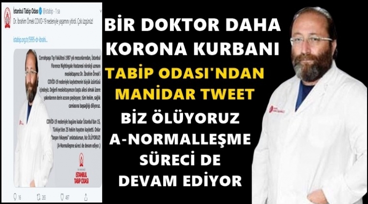 “Nöroloji uzmanı meslektaşımız Dr. İbrahim Örnek'i COVİD-19 nedeniyle kaybetmenin büyük üzüntüsü içindeyiz. Değerli meslektaşımızın başta ailesi olmak üzere yakınlarının derin acısını paylaşıyor, tüm hekim, sağlık camiasına başsağlığı diliyoruz.”
