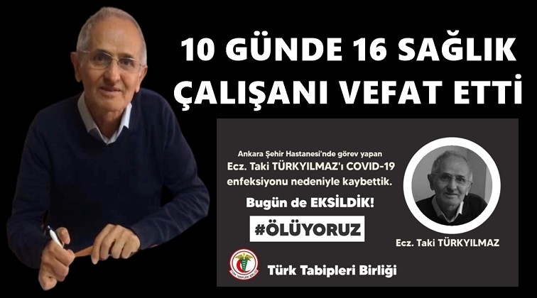 Corona virüsü (COVID-19) nedeniyle bir sağlık çalışanı daha yaşamını yitirdi. Türk Tabipleri Birliği (TTB), Ankara Şehir Hastanesi’nde görev yapan Ecz. Taki Türkyılmaz’ın Covid-19 enfeksiyonu nedeniyle yaşamını yitirdiğini “Bugün de eksildik. Ölüyoruz” diye duyurdu.