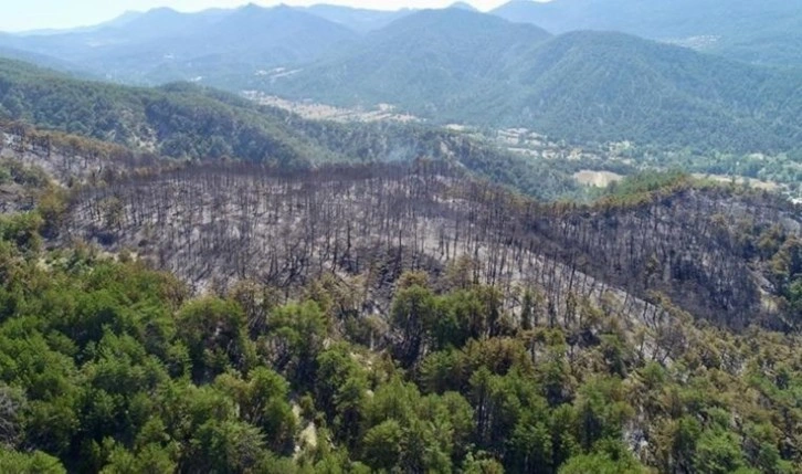 Bölgede, soğutma çalışması başlatıldı. Yangında zarar gören ormanlık alan, Dedeler Köyü mevkisinde havadan görüntülendi.