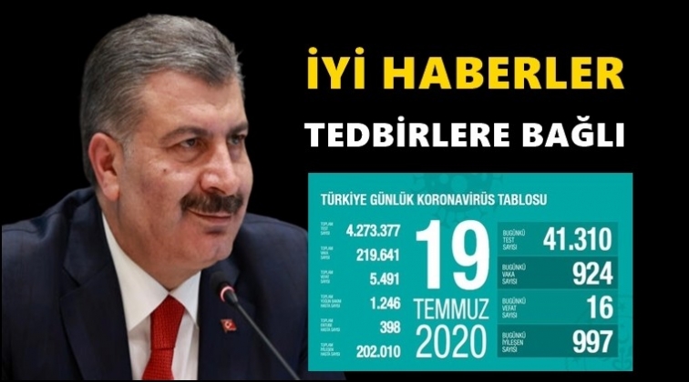 Sosyal medya hesabından açıklama yapan Sağlık Bakanı Fahrettin Koca, “Her gün 1000'e yakın hastamız şifa buluyor, 1000’e yakın yeni vakamız oluyor. Yeni vakaları durdurabilirsek aktif vaka sayısı hızla azalmış olacak. Hedefimiz; iyileşen sayısında artış, yeni vaka sayılarında düşüş. İyi haberler, alacağımız tedbirlere bağlı” ifadelerini kullandı.