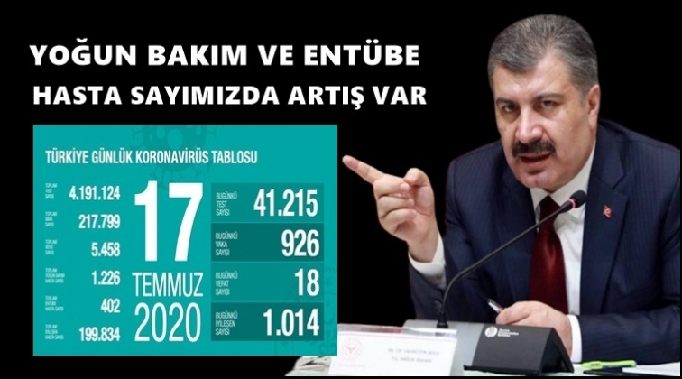 Türkiye'deki güncel corona virüsü verileri açıklandı. Sağlık Bakanı Fahrettin Koca'nın duyurduğu verilere göre, son 24 saatte 18 kişi hayatını kaybederken 926 yeni vaka tespit edildi. Toplam vaka sayısı 217 bin 799'a, toplam can kaybı da 5 bin 458'e yükseldi. Bakan Koca, yoğun bakım ve entübe hasta sayısında devam eden tedavilere bağlı artış olduğunu belirtti.