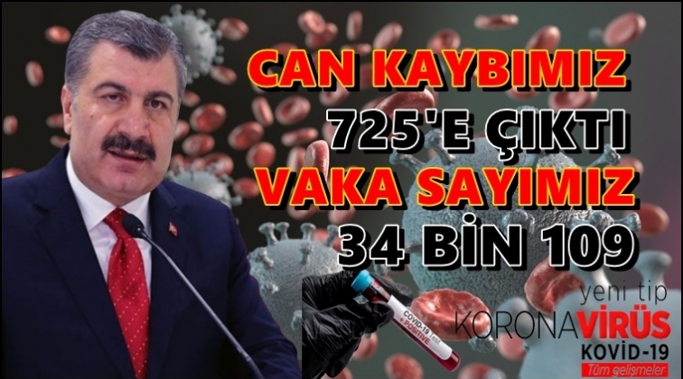 Bakan Koca, son 24 saatte 3 bin 892 vaka tespit edildiğini ve 76 can kaybı yaşandığını açıkladı. Türkiye'deki toplam vaka sayısı 34 bin 109'a can kaybı ise 725ê yükselmiş oldu. Tedavi edilen hasta sayısı ise bin 582 olarak açıklandı.