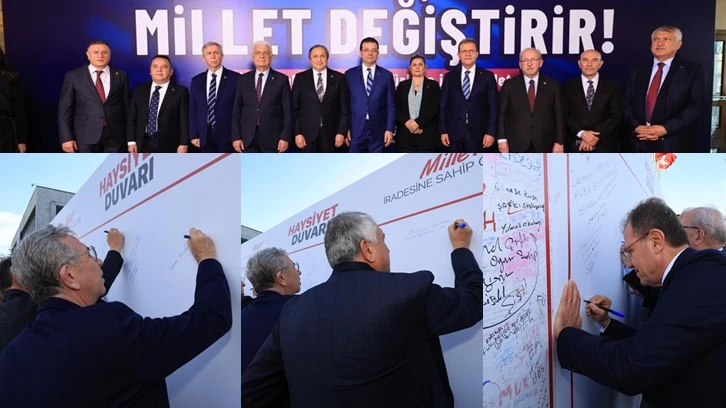 CHP Genel Başkan Yardımcısı Seyit Torun ve Millet İttifakı’na mensup CHP’li Büyükşehir Belediye Başkanları, hakkında hapis ve siyasi yasak kararı verilen İstanbul Büyükşehir Belediye (İBB) Başkanı Ekrem İmamoğlu’na destek olmak amacıyla Saraçhane’de buluştu. Torun ile Büyükşehir Belediye Başkanları Mansur Yavaş (Ankara), Tunç Soyer (İzmir), Osman Gürün (Muğla), Kadir Albayrak (Tekirdağ), Özlem Çerçioğlu (Aydın), Muhittin Böcek (Antalya), Zeydan Karalar (Adana), Vahap Seçer (Mersin) ve Lütfü Savaş (Hatay), CHP İl Gençlik Kolları tarafından İBB ana yerleşkesinin önünde konumlandırılan “Haysiyet Duvarı”nın önünde buluştu. “Haysiyet Duvarı”na imza atan ve duygularını aktaran heyet, anı fotoğrafı çektirdi.