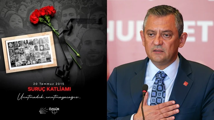 Şanlıurfa'nın Suruç ilçesinde 33 gencin öldürüldüğü saldırıya ilişkin anma mesajı yayımlayan CHP Genel Başkanı Özgür Özel "Suruç katliamı'nı unutmayacağız, unutturmayacağız" paylaşımında bulundu.