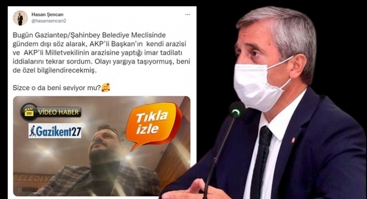 Şencan, o anları cep telefonundan kaydederek sosyal medya hesabından paylaştı. Şencan paylaşımında, "Bugün Gaziantep/Şahinbey Belediye Meclisinde gündem dışı söz alarak, AKP’li Başkan’ın kendi arazisi ve AKP’li Milletvekilinin arazisine yaptığı imar tadilatı iddialarını tekrar sordum. Olayı yargıya taşıyormuş, beni de özel bilgilendirecekmiş. Sizce o da beni seviyor mu?" ifadelerini kullandı.