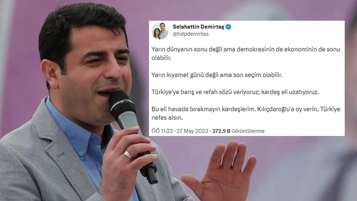 Selahattin Demirtaş, sosyal medya hesabından yaptığı paylaşımda, "Yarın kıyamet günü değil ama son seçim olabilir.” dedi.