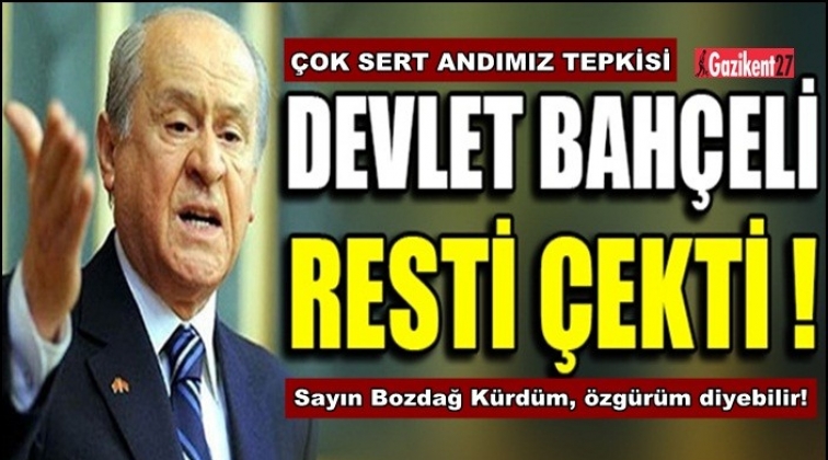 "Sayın Bekir Bozdağ Danıştay kararına çok bozulmuş, anayasa ve yasanın alenen çiğnendiğini söylemiş. İşine geldi mi yargıya saygıyı bekleyen, işine gelmedi mi yasa çiğnendi diyen Sayın Bozdağ ve onun gibi düşünenlerin hala çözülme süreci üslubuna müracaatları talihsizliktir" diyen Bahçeli, "Sayın Bozdağ Kürdüm, özgürüm diyebilir. Dilini tutan yoktur. Sus otur yerine diyen de yoktur. Buyursun, mizaç ve meşrebine müzahir değerlendirmesini yapsın. Türk milleti kendisini en güzel ve yüksek mevkilere taşımıştır. Ama kendisi Türk milletini düşürmeyi aklından geçirmesin. PKK’lıyım, bölücüyüm, Kürdistan için çalışırım diyen varsa cezası bellidir, sonuçlarına katlanacaktır. Uyarıyorum, Sayın Bozdağ buna çok dikkat etsin. 81 ilde basın açıklaması yapan malum bir sendikanın başkanı da durum muhasebesi ve özeleştiriyi yapacak milliliği göstersin. Papaz kuş gibi uçar gider yargı kararı denilir. Andımızla ilgili yine yargı karar verir, ne var ki karşı çıkılır. Bunun neresi adil, neresi ahlakidir? Andımız milli kimliğimizin alameti farikalarından birisidir. Sevmeyen varsa sussun, okumayacak varsa kendi işine baksın" ifadelerini kullandı.