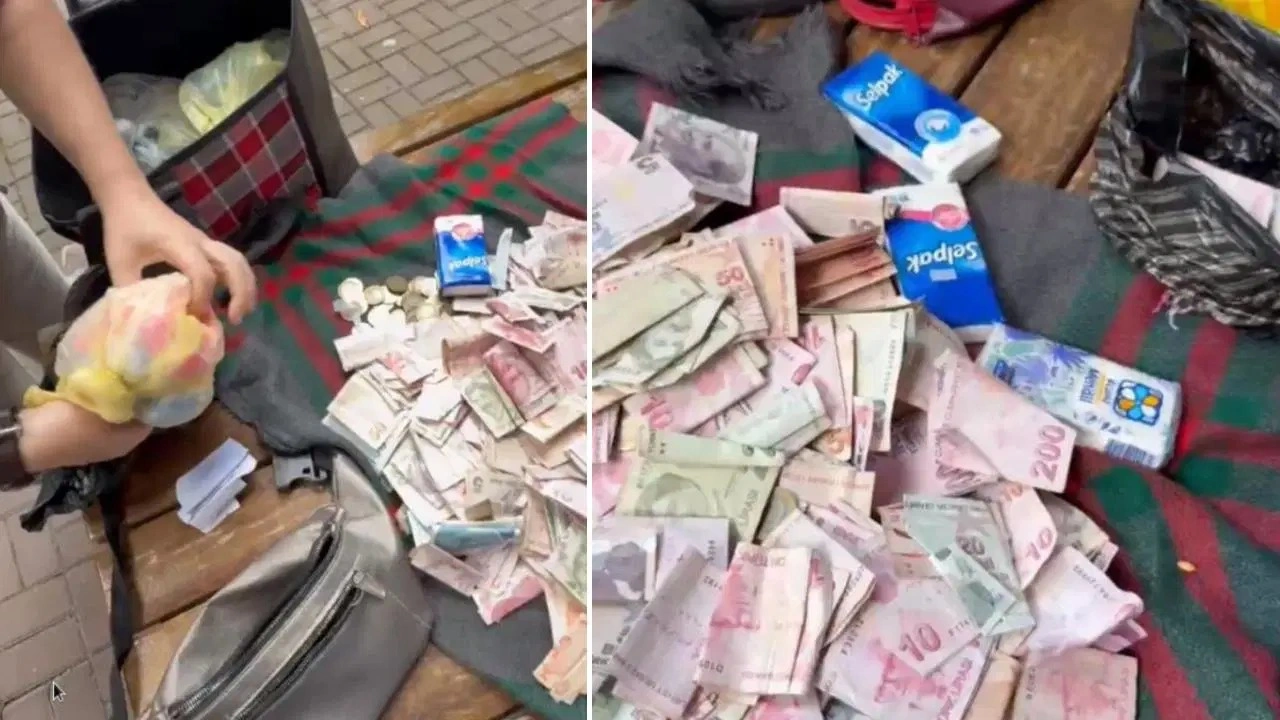 Dilencilik yaptığı belirlenen kadının pazar arabasında ve üzerindeki poşetlerde paralar ve 10 çeyrek altın bulundu. Toplam 35 bin 985 TL nakit paraya ulaşıldı.