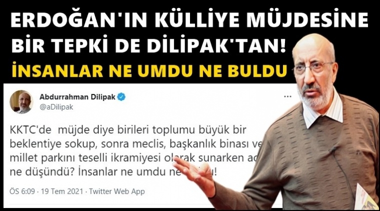 AKP’ye yakınlığıyla bilinen Yeni Akit yazarı Abdurrahman Dilipak, AKP'li Cumhurbaşkanı Erdoğan'ın KKTC Cumhurbaşkanlığı'na ve KKTC Meclisi'ne yeni bir külliye inşaatı yapılacağını müjdelemesine sosyal medya hesabı üzerinden tepki gösterdi. Dilipak ayrıca, Erdoğan’ın Türk-Rum karşıtlığı üzerine kurduğu konuşmasını da eleştirdi.