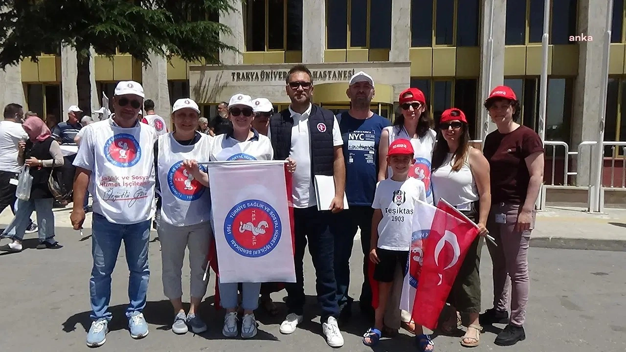 Türkiye Sağlık ve Sosyal Hizmet İşçileri Sendikası’na bağlı Sağlık-İş ve Tez-Koop İş üyeleri, Trakya Üniversitesi Hastanesi önünde eylem yaptı.