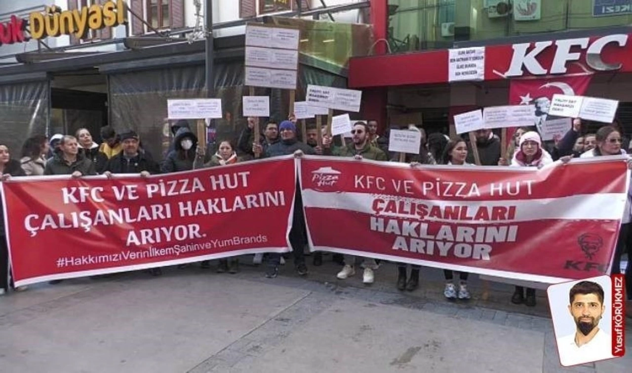 Dün KFC Alsancak Şubesi önünde toplanan işçiler, şubenin tabelasına “KFC ve Pizza Hut işçileri haklarını arıyor” pankartı astı.