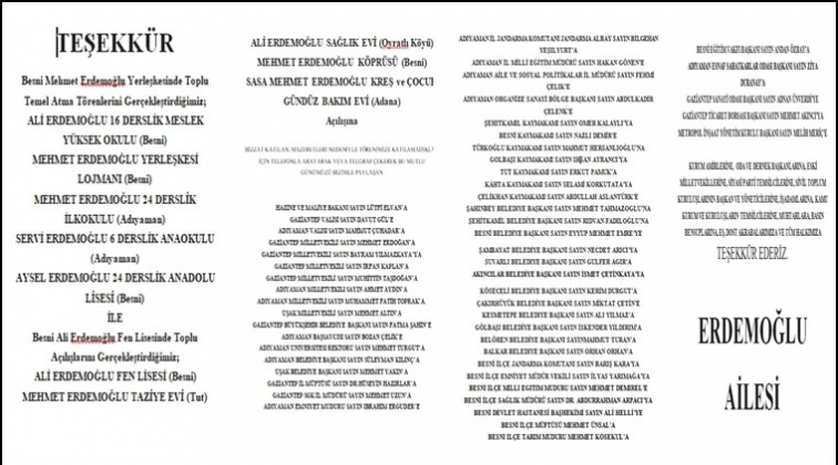 Erdemoğlu Ailesi, Adıyaman ve Besni ilçesinde yapılan toplu açılış törenleri dolayısıyla bir teşekkür metni yayımladı.