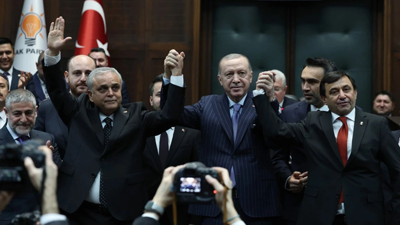 AKP'li Cumhurbaşkanı Erdoğan partisinin grup toplantısında AKP'ye katılan 3 milletvekiline rozet taktı.