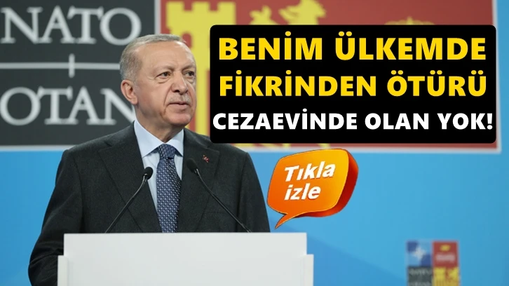AKP’li Cumhurbaşkanı Recep Tayyip Erdoğan, Türkiye’de fikrinden dolayı cezaevinde olan hiç kimsenin olmadığını iddia etti. Erdoğan, “Benim ülkemde cezai bir durum olmadıkça gazeteci kalemşor fikir bunlardan cezaevlerinde olanlar yok. hepsi bunların sadece dezenformasyon” dedi.