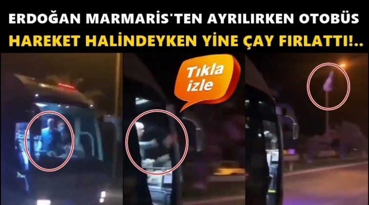 Yangın felaketlerinin yaşandığı Marmaris'te vatandaşa seslenen Erdoğan, ardından çay dağıtımı yaptı. Erdoğan'ın Marmaris'ten ayrılırken de yol kenarında bekleyen vatandaşlara otobüsten çay fırlattığı görüldü.