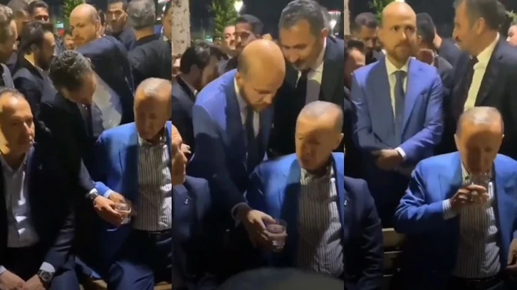 Erdoğan'ın, oğlu Bilal Erdoğan'ın suyu uzatmasından sonra bardağı kabul ettiği görüldü.