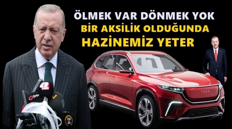 Cumhurbaşkanı Recep Tayyip Erdoğan, Türkiye'nin Otomobili Girişim Grubu'nun (TOGG) fabrikası için düzenlenen temel atma töreninde açıklamalarda bulundu. Erdoğan, "5 iş adamıyla yola çıktık. Öyle ya da böyle. Ölmek var dönmek yok. Herhangi bir aksilik olduğunda devletimizin hazinesi bu işi bitirmeye yeter" dedi.