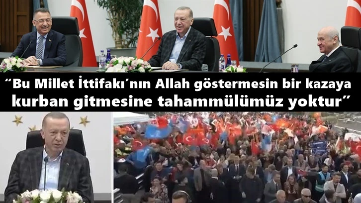 Erdoğan konuşmasının son cümlelerinde "Bu Millet İttifakı'nın bir kazaya gitmesine tahammülümüz yoktur" ifadelerini kullandı.