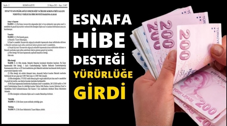 Corona virüsü salgınından etkilenen esnafa yönelik hibe kararı, Resmi Gazete'de yayımlanarak yürürlüğe girdi. 5 bin ila 3 bin lira hibe desteğinden 17 Mayıs itibarıyla gelir vergisi mükellefi olan esnaf yararlanabilecek.