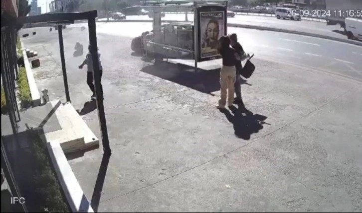 Ardından otomobilin otobüs durağına daldığı, durakta bekleyen vatandaşların korkuya kapılarak kaçtığı, kaçarken 2 vatandaşın yere düştüğü görülüyor. Korku dolu anlar güvenlik kamerasına saniye saniye yansıdı.
