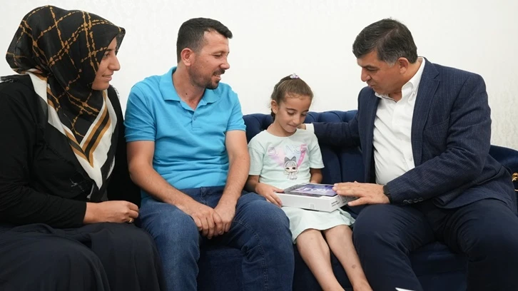 Ahmet ve İdat Öksüz çiftinin kızı Feyza’yı evinde ailesiyle birlikte ziyaret eden Başkan Rıdvan Fadıloğlu, Feyza’nın karnesini inceledi, ailesinden eğitim durumuyla ilgili bilgi aldı. Feyza Öksüz’e başarılı karnesi ile 15 Türkiye Yüzyılı’nın Kahramanları 15 Temmuz Demokrasi ve Milli Birlik Günü Anma Programı’nda ortaya koyduğu özgüvenli davranışı, medeni cesaretinden dolayı oyuncak bebek, satranç takımı, suluk, kitap ve tablet hediye etti.
