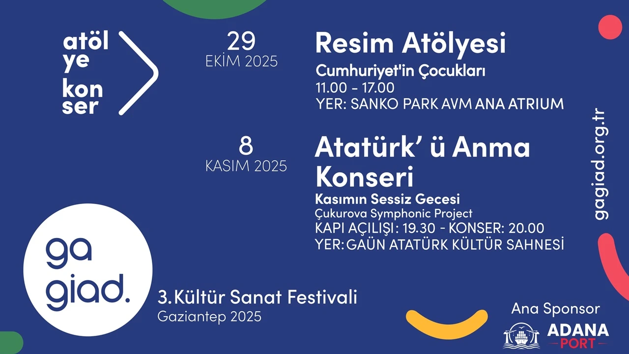 Adana Port ana sponsorluğunda; Güllüoğlu Baklavaları – Ömer Güllü ve Sınır Beton Elemanları proje destekçiliğinde düzenlenecek GAGİAD 3. Kültür Sanat Festivali 2025, Gazianteplileri ve şehri ziyaret eden sanatseverleri çok yönlü bir programla buluşturacak. 29 Ekim ve 8 Kasım 2025 tarihleri arasında sürecek festival; “Cumhuriyet’in Çocukları” Resim Atölyesi, “Cumhuriyet’in Nefesi: Ormanlar” Sergisi ve “Atatürk’ü Anma Konseri: Kasım’ın Sessiz Gecesi” gibi seçkin etkinliklerle şehri sanatın evrensel diliyle yeniden buluşturacak.